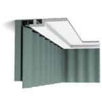 Listwa karniszowo-sufitowa C395 to lekka, biała listwa wykonana z poliuretanu – materiał o wysokiej gęstości pozwalający uzyskać wyraziste szczegóły.