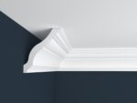 Gzyms sufitowy z polistyrenu XPS (styrodur). Zastosowany materiału charakteryzuje się lekkością, równocześnie trwałością i wysoką estetyką wykonania, a także gładkością struktury. Jest doskonałą, ekonomiczną alternatywą dla drogich listew i gzymsów sufitowych wykonanych z poliuretanu.