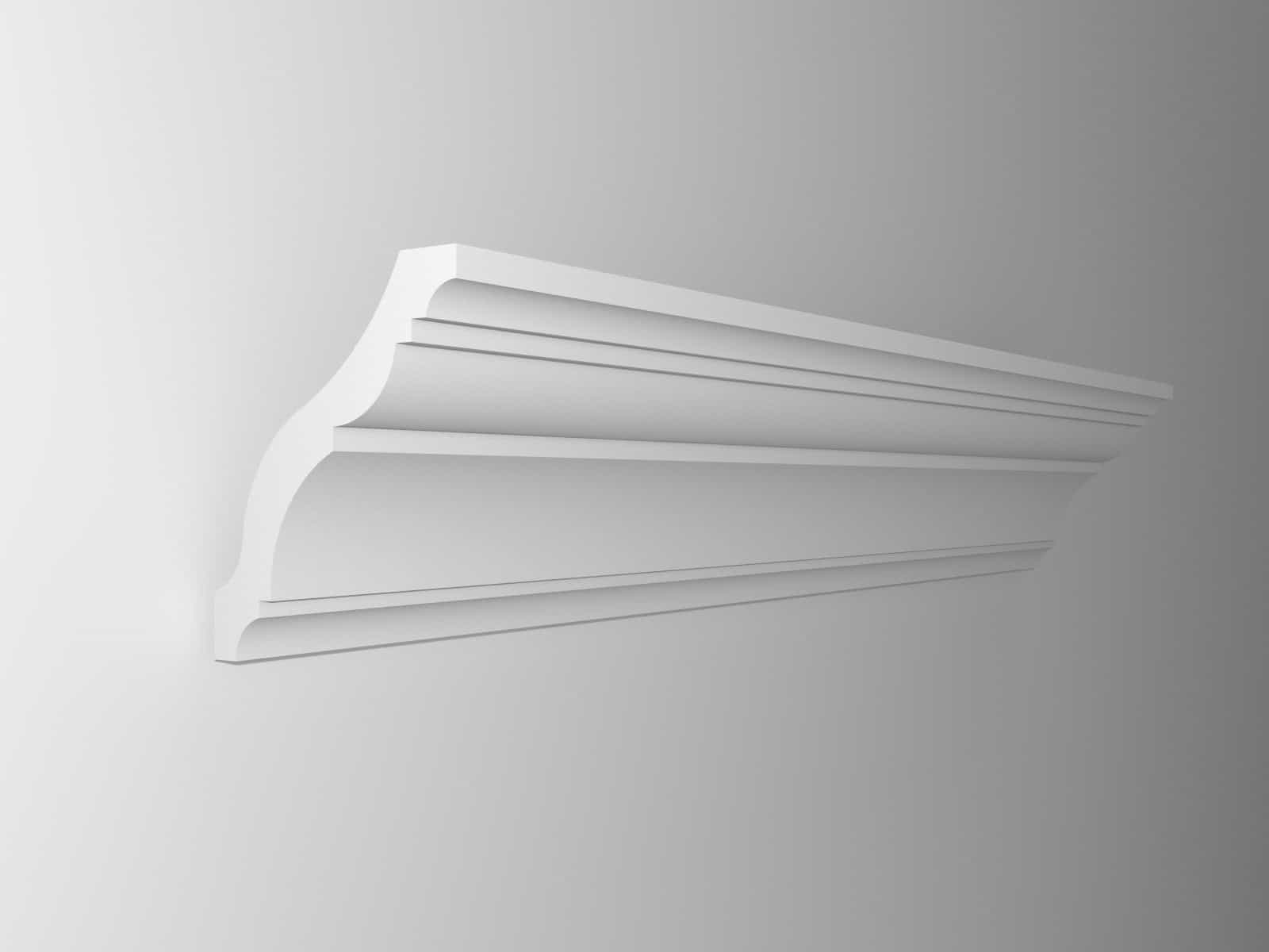 Gzyms sufitowy z polistyrenu XPS (styrodur). Zastosowany materiału charakteryzuje się lekkością, równocześnie trwałością i wysoką estetyką wykonania, a także gładkością struktury. Jest doskonałą, ekonomiczną alternatywą dla drogich listew i gzymsów sufitowych wykonanych z poliuretanu.